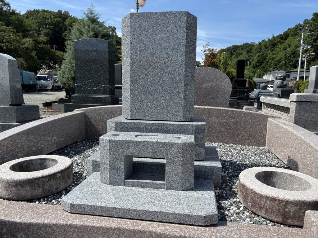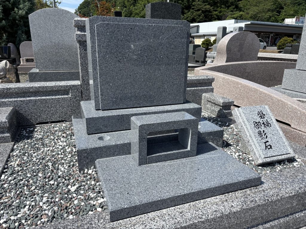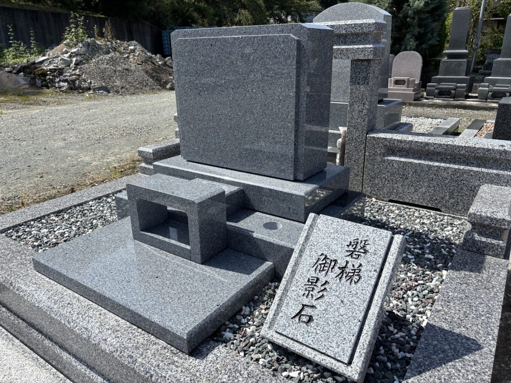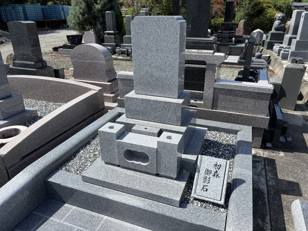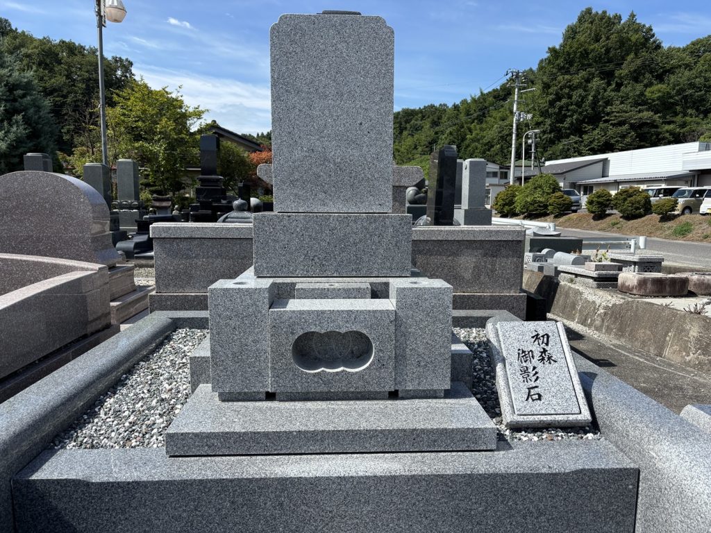 こちらは地元初森地区産出の墓石材。完全自社加工で作製いたしました。御位牌をモチーフに重厚感のある佇まいとなっています。